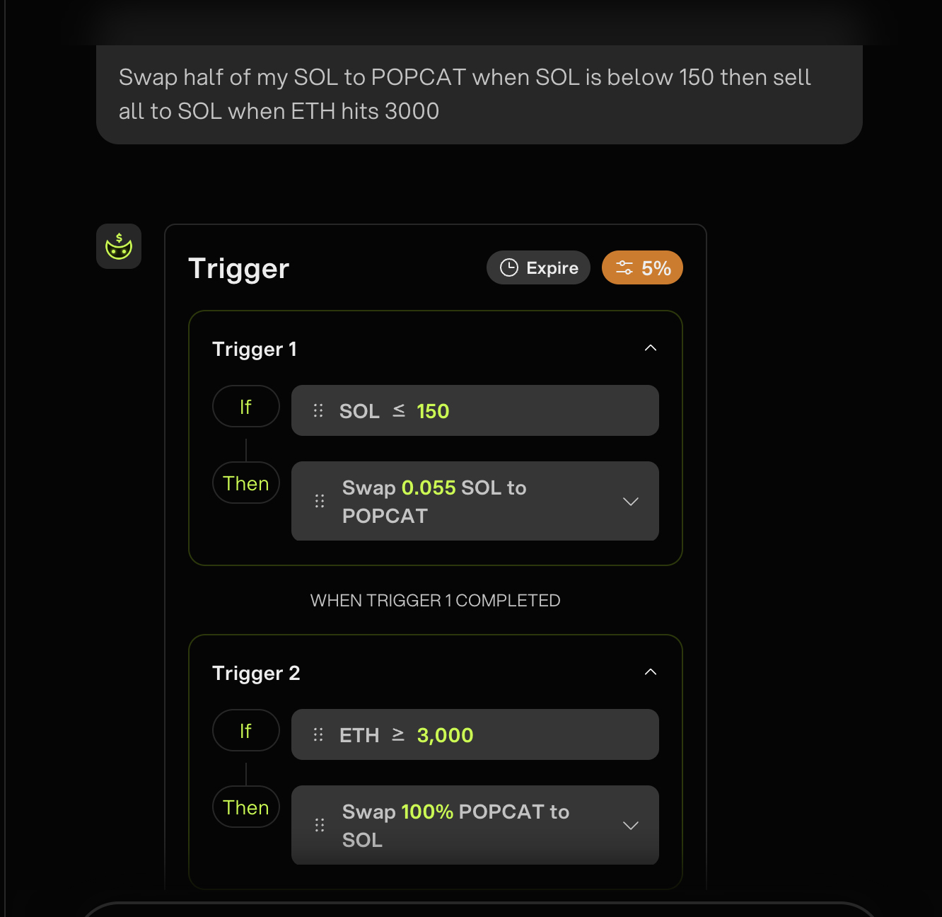 Swap **half of my SOL** to **POPCAT** when **SOL** is below 150 then **sell all to SOL** when **ETH hits 3000.**