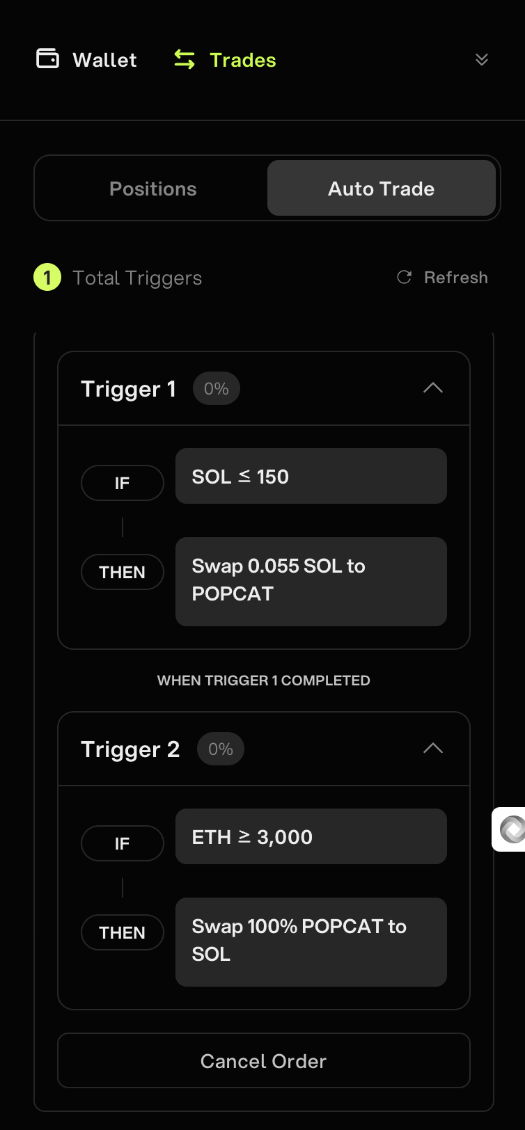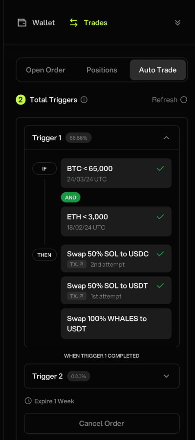 You will be able to track the progress of your auto trade orders in the open order menu. If it is showing green checks next to the trigger, it means that the conditions are met and the orders are being executed.